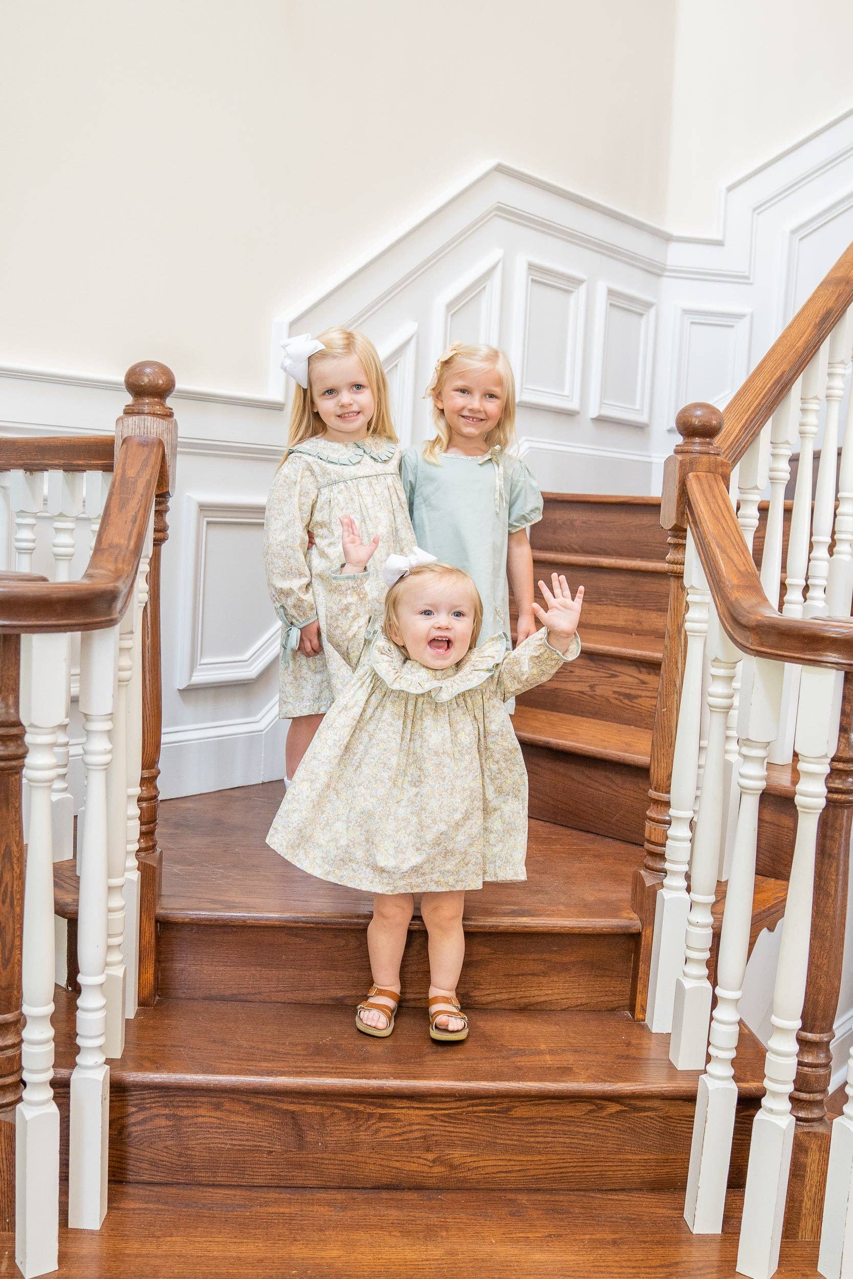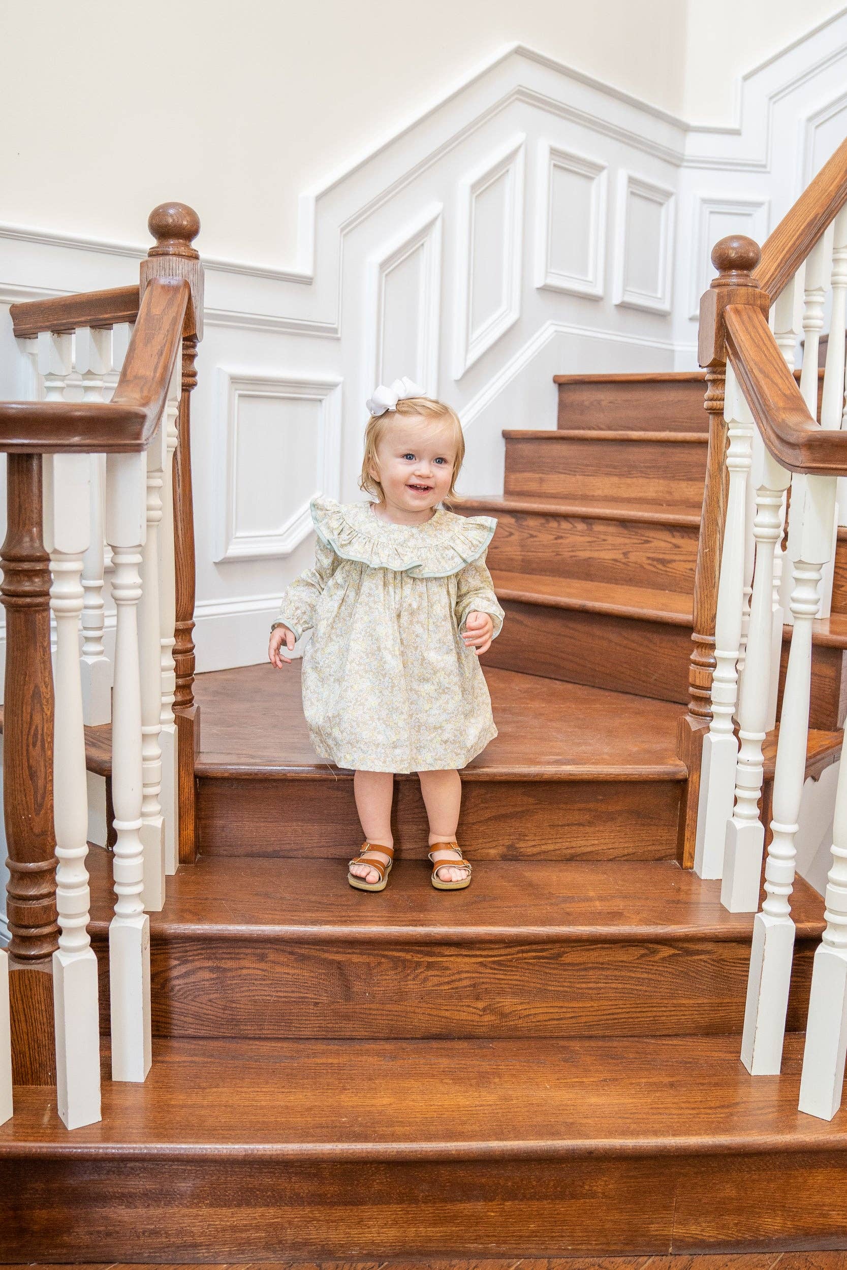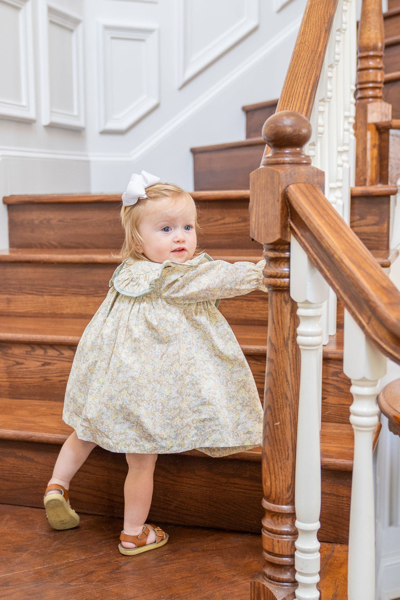 Let your little one bloom in style with the Layla Tan Floral Bloomer Set! This adorable outfit features a tan floral pattern, olive trim, and ruffles on the collar that make it a surefire hit for any toddler fashionista. With its playful fabric and unique details, it's sure to bring a smile to all who witness it! This would so cute with the John Tan Linen Short Set for a perfect sibling set.