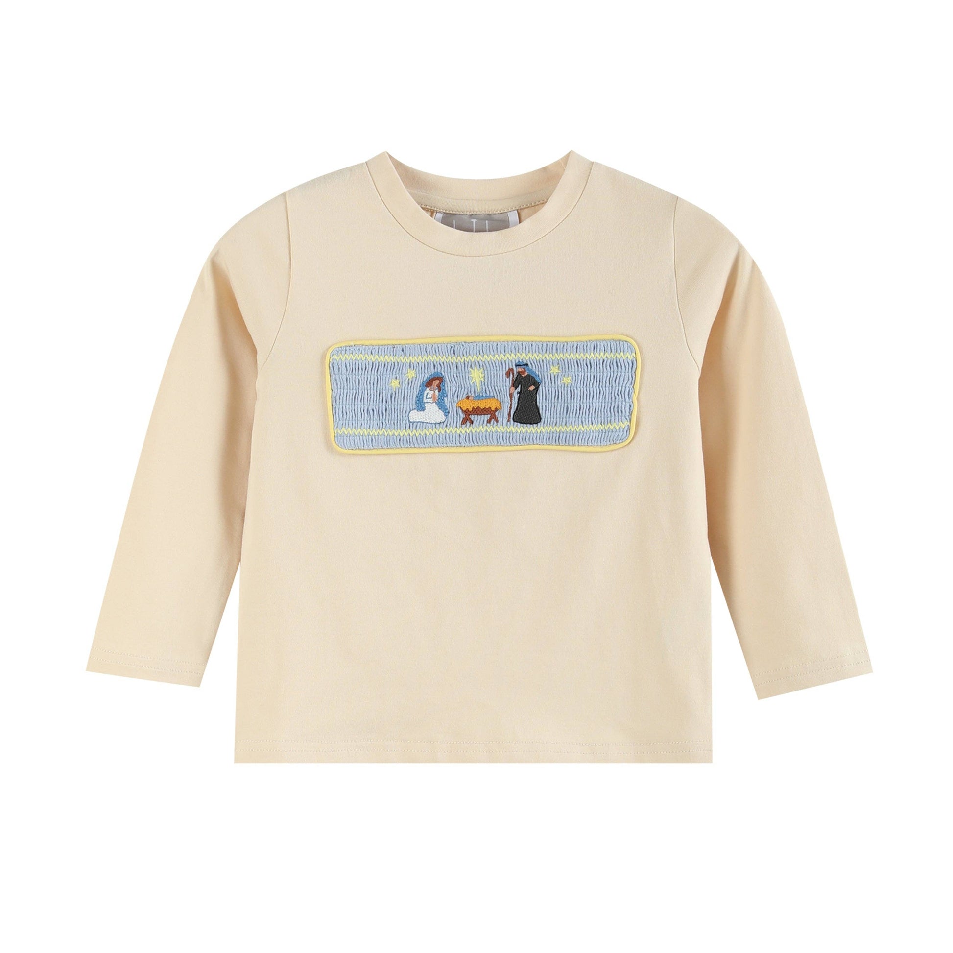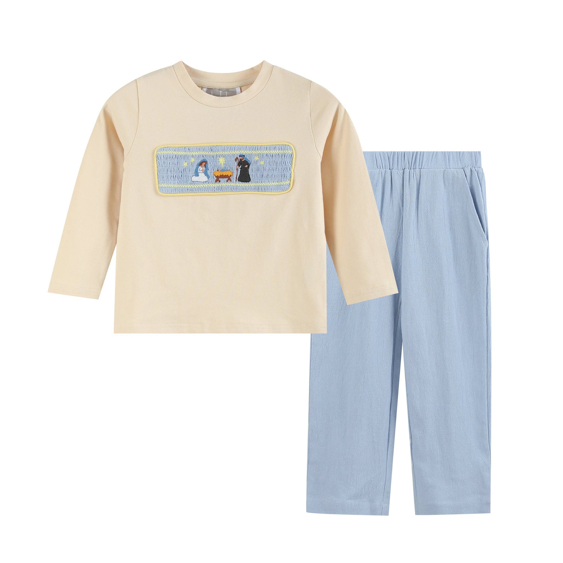 Light Brown Nativity Smocked Shirt and Blue Pants